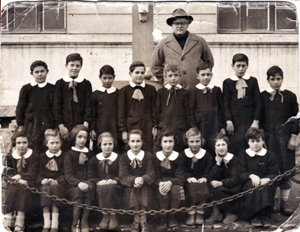 La mia prima uscita è con il Gallante (soprannome ricco di significati!). Attende fuori dall’albergo per accompagnarmi a scuola. Pierino era perfettamente intonato al paese che, a quei tempi, avrebbe mal sopportato una guardia in divisa all’americana. Il Gallante si metteva subito in evidenza per tre caratteristiche: corporatura minuta, cappello consumato dall’uso; abitudine di guardare il suo interlucotore, ma un punto indefinibile all’orizzonte, tanto che chi gli stava davanti credeva di avere qualcuno alle spalle e si voltava. Dopo pochi passi, giungemmo alla scuola elementare, il tipo di costruzione più diffuso in Italia negli anni trenta, quando ogni piccolo comune ne fu dotato: due porte d’ingresso (per maschi e femminei, due piani; ogni piano due aule, il che svela il difetto nazionale dell’imperfezione che si perpetuerà nei secoli, visto che anche allora le classi elementari erano cinque. Si tenevano le lezioni del turno pomeridiano e il mio Virgilio, guardando verso le finestre, mi presentò alla maestra fiduciaria, signorina Arangio, davanti a una cinquantina di ragazzi silenziosamente e rispettosamente in piedi. La collega, attempate e tracagnotta, mi accolse in modo festoso. Troppo, troppo festoso mi sembrò. Ombrò. Aveva uno sguardo che doveva essere dolce invece riportava alla mente la faccenda del pugno di ferro sotto il guanto di velluto. Mi assegnò la classe, la quarta, i cui componenti affollavano la parte destra dello stanzone, maschi curiosi, femmine preoccupate, levandosi la soddisfazione di predire loro un futuro cupo, visto che il nuovo insegnante era un « MAESTRO », genere maschile, quindi naturalmente severo, inflessibile (leggi cattivo) che avrebbe imposto norme tratte dai regolamenti carcerari della Caienna. Molti furono i sospiri dei minacciati. Una biondina dalle lunghe trecce passò rapidamente dal rosso acceso al bianco lenzuolo e si accasciò senza più forze sul banco.