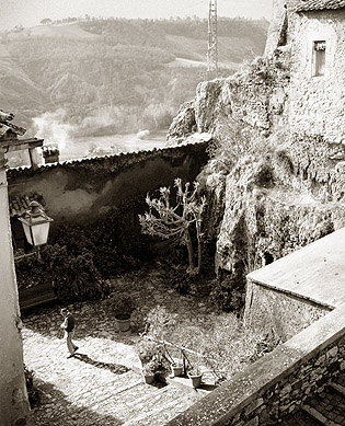 Era il centro del nostro mondo per partire poi verso le altre mete, le altre vie, le altre vite ed approdare, scorrazzare, ossigenare, ozia­re in via dell’arco, in via del borgo, in Piazza San Giovanni, a largo del bivio, a vicolo stretto, in via delle scalacce, in via della provvi­denza, via della rocca, piazza dell’ospizio, via del pericolo che nonostante il nome dovuto ad una vecchia precarietà della via, il nostro mondo, il nostro borgo, era forse la zona più sicura, per i giochi di ragazzi irrequieti che stavano crescendo, lontano da strade traffica­te da nuove potenti e veloci autovetture.