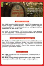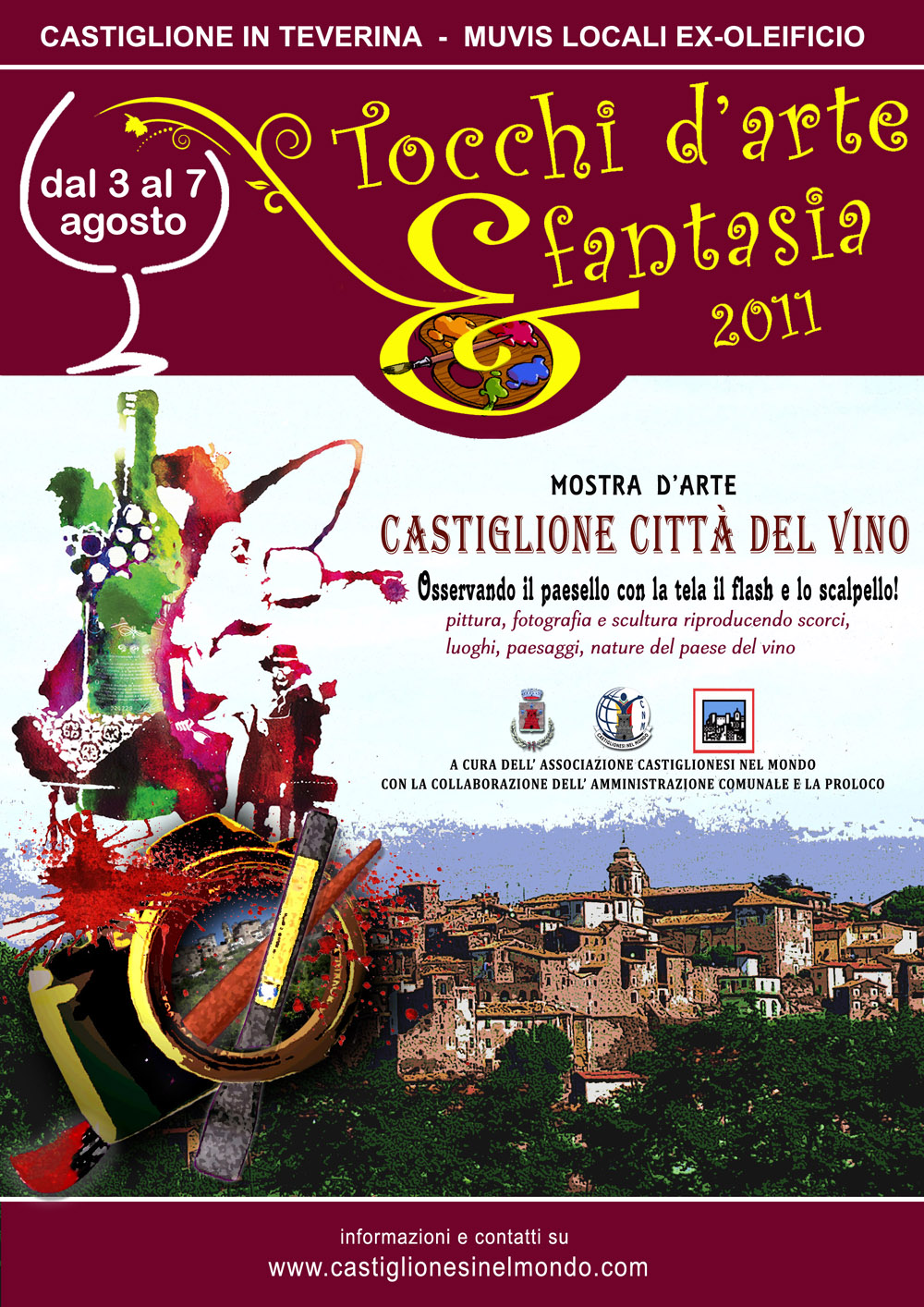 Visto il successo dello scorso anno l’Associazione Castiglionesi nel Mondo ripropone anche quest’anno l’evento culturale. L’idea è quella di dare a tutti i castiglionesi appassionati di pittura, fotografia e scultura la possibilità di esprimersi con il proprio talento artistico, riproducendo scorci, luoghi, paesaggi, nature, legati al paese del vino. Verrà dato spazio anche a coloro che amano scrivere poesie. Le opere verranno esposte durante i giorni della Festa del Vino presso il MUVIS locale ex oleificio. I partecipanti dovranno dichiarare di aver preso visione del regolamento predisposto dall’organizzazione. FOTOGRAFIA: Per agevolare gli espositori, l’ACNM si farà carico della stampa e dell’incorniciatura delle foto, le quali potranno essere inviate anche in formato digitale all’indirizzo E-mail: associazione.cnm@gmail.com Potranno essere esposte anche vecchie foto e cartoline sul paesaggio castiglionese. Su ciascuna foto dovrà essere indicato: l’autore, la didascalia e possibilmente l’anno dello scatto. Importante: per una migliore qualità di stampa, si raccomanda di inviare le foto digitali nella grandezza originale. REGOLAMENTO Art. 1 Art. 2 Art. 3 Art. 4 Art. 5 Art. 6 Art. 7